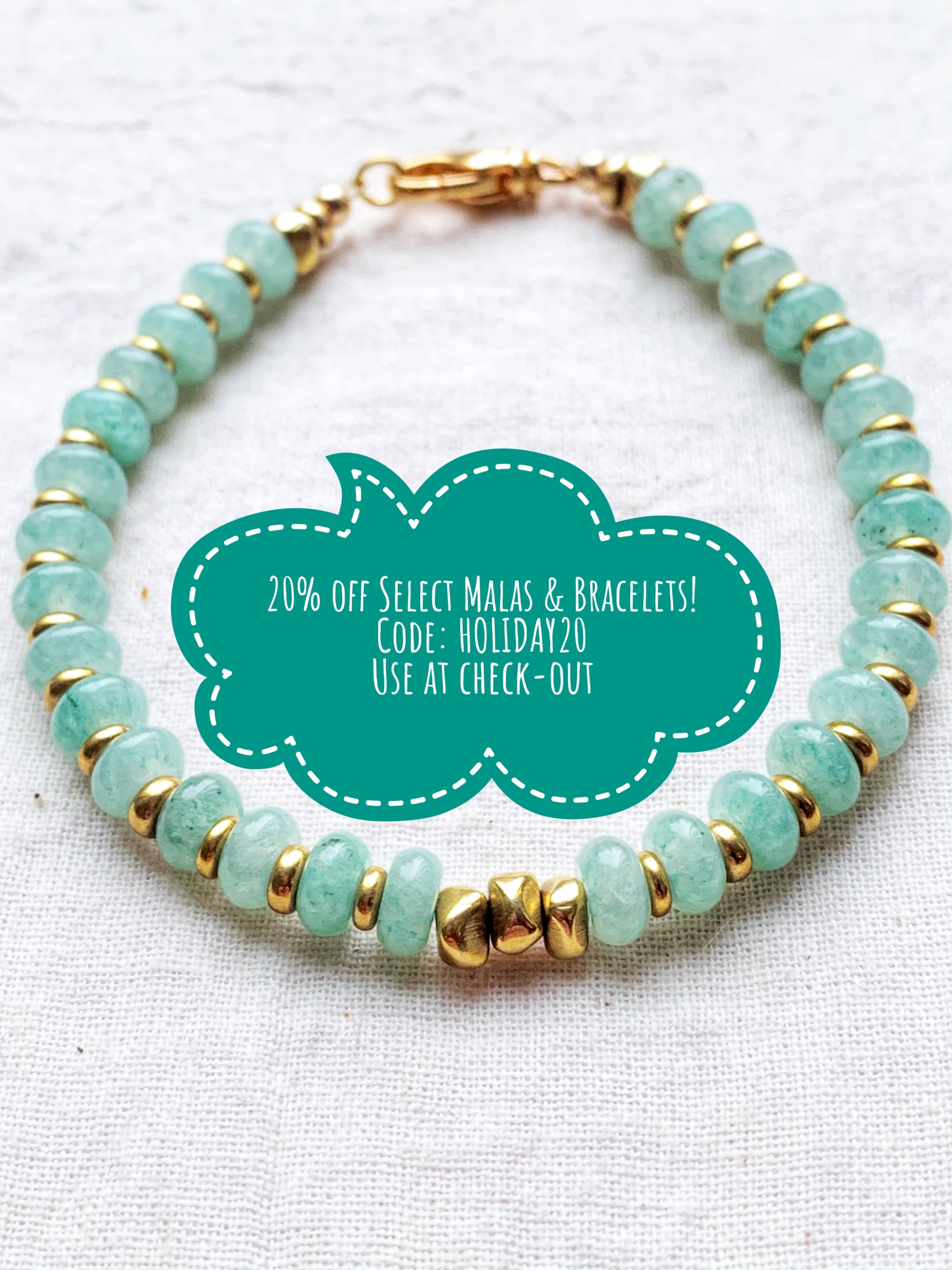 Just in time for the holidays! Do you know someone who could use a little love, joy, and peace? Each piece I make is made with love and mantra (tiny prayers of love and peace). Right now select malas and bracelets are 20% off in my shop. At checkout, use the code: HOLIDAY20.